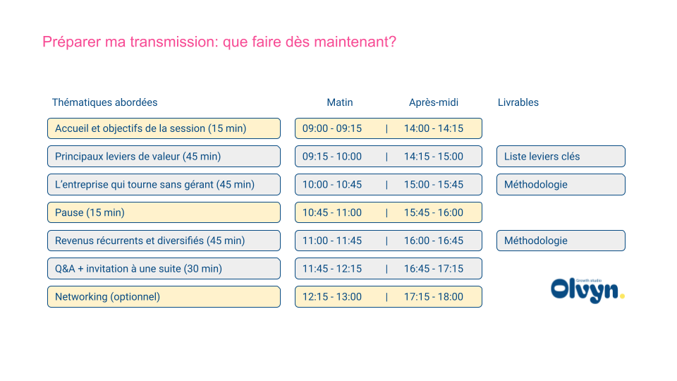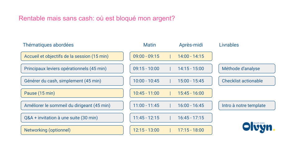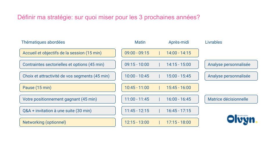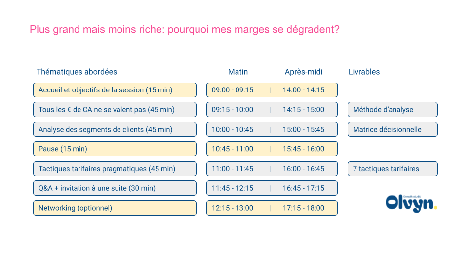 Nos ateliers d'une demi-journée sont pertinents pour les dirigeants, ainsi que leurs équipes commerciales, marketing et financières. L'occasion parfaite de s'ouvrir à de nouvelles perspectives, rencontrer d'autres leaders et développer des outils concrets. Le nombre de participants par session est limité à 8-10 personnes pour favoriser un dialogue personnalisé et le développement d'outils concrets.